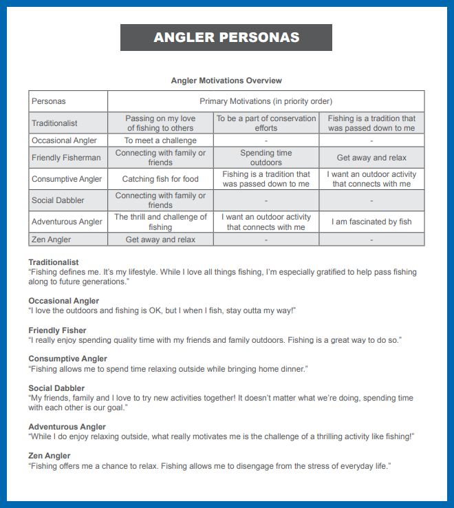 This study identified seven unique personas that comprise U.S. anglers. These angler personas, constructed around motivations to participate in sportfishing, span the demographic spectrum, have different levels of experience, and participate in different types of fishing. By understanding the core reasons why people fish, both state agency professionals and the private sector will be better equipped to maintain participation and sales.